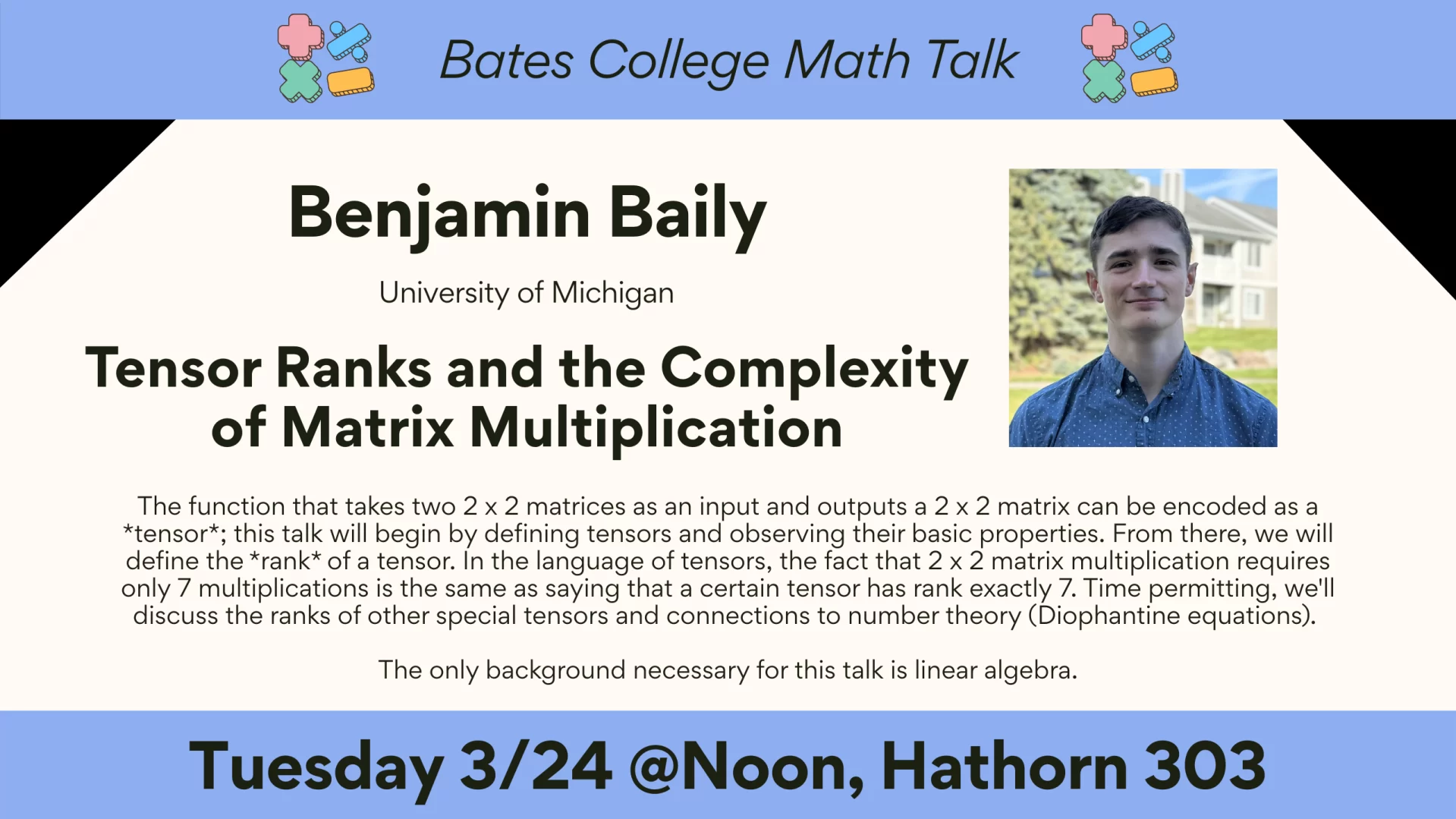 - Tensor ranks and the complexity of matrix multiplication. Bates College math talk, March 2026.